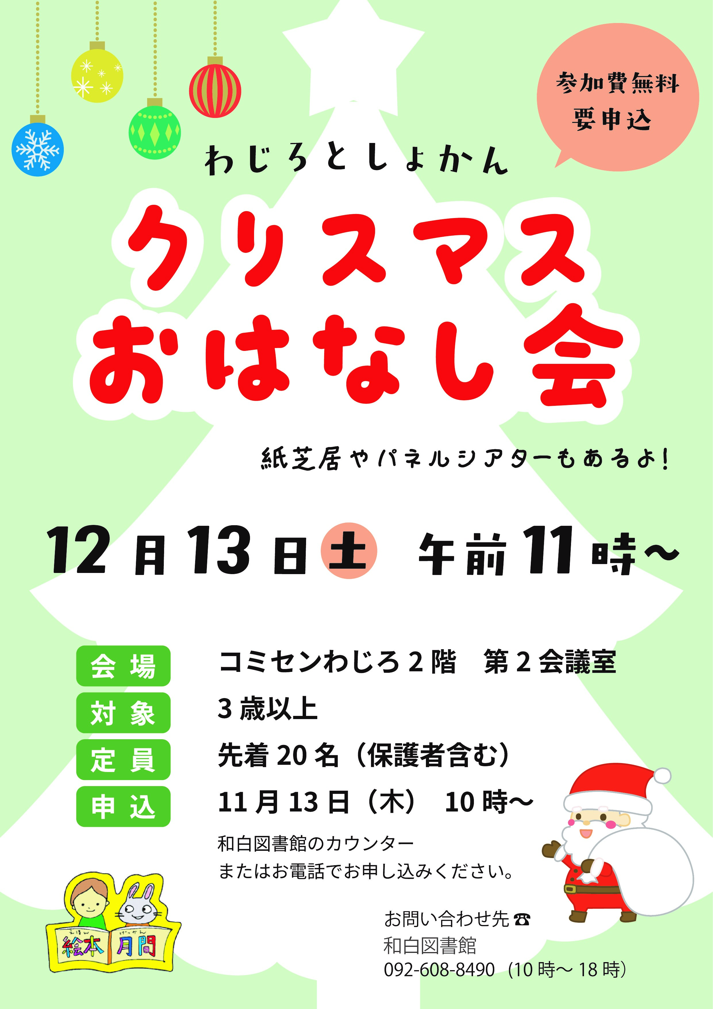 クリスマスおはなし会では、絵本やパネルシアターなどクリスマスにちなんだおはなしを読みます。ぜひ遊びに来てくださいね。