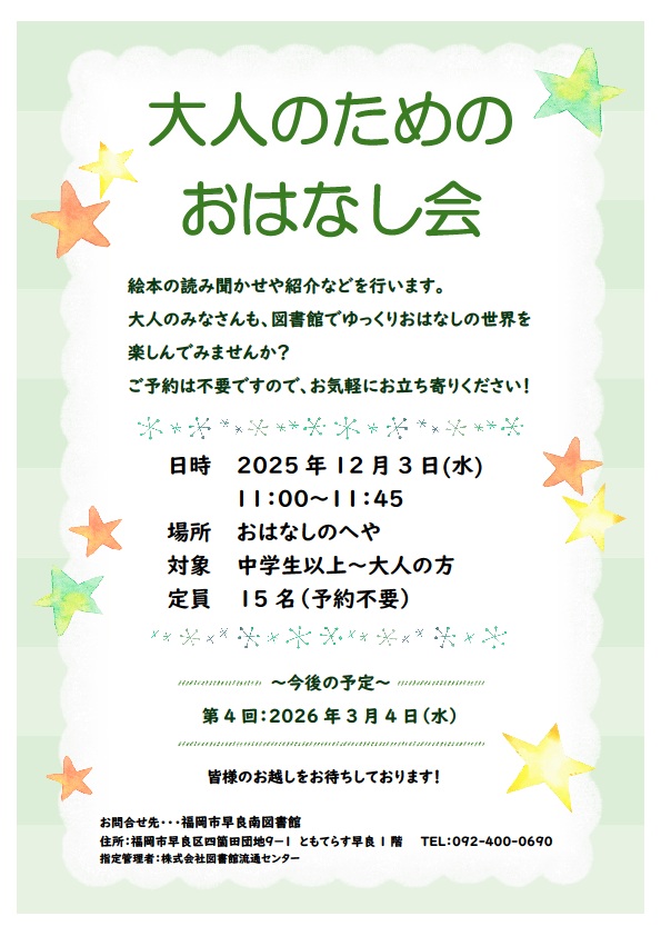 12月3日は、大人の方を対象にしたおはなし会を行います。