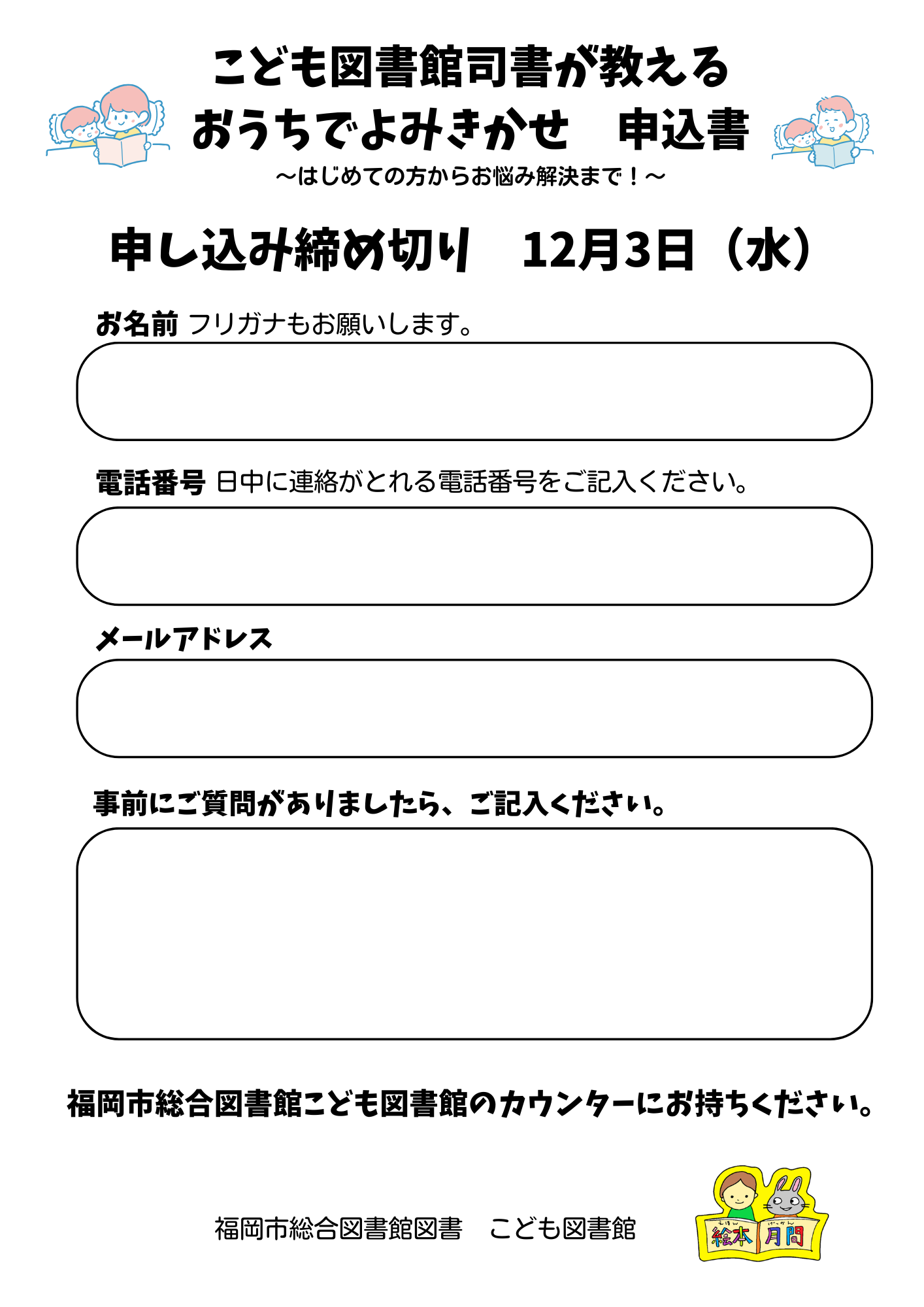 申込書にご記入の上、福岡市総合図書館こども図書館のカウンターにご持参いただくか、下記URLよりお申込みください。