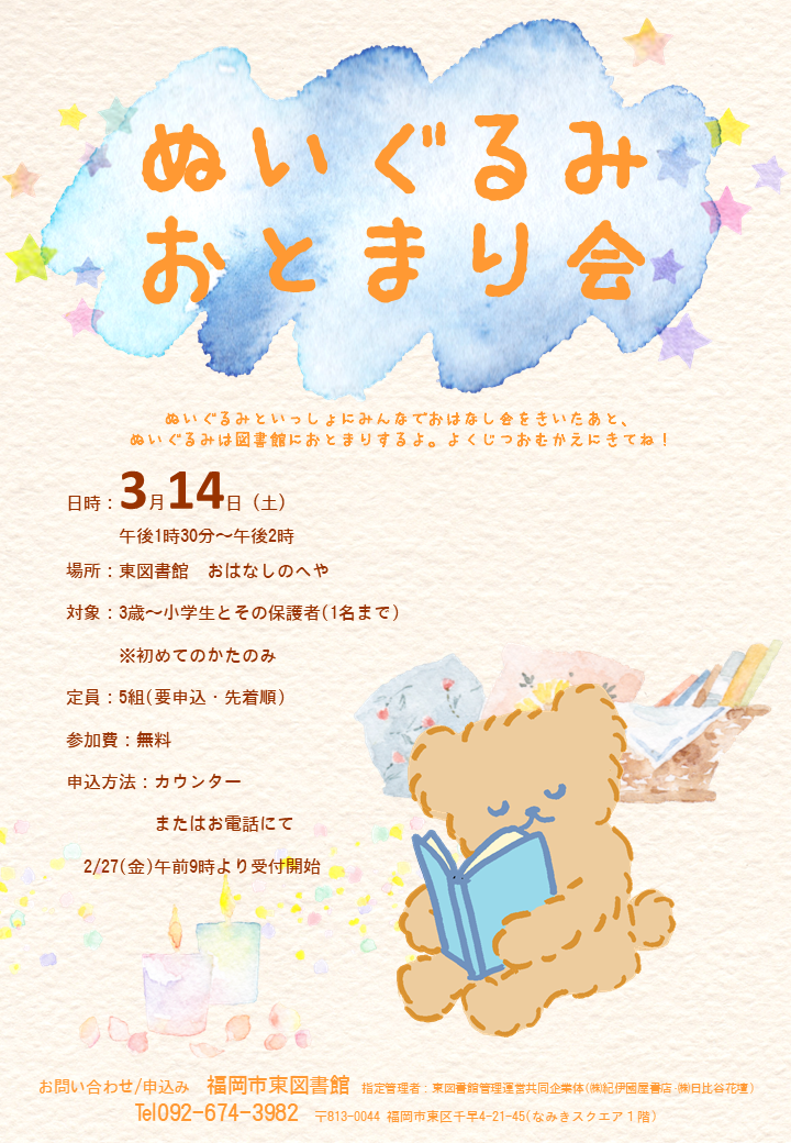 | 事前申込み | 要申込 : 2月27日(金)9:00~ 東図書館カウンター または お電話092-674-3982まで |
