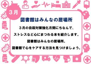 3月は自殺対策強化月間です。 ストレスなどメンタルに負担のかかるこの時期に、メンタルケアに関する本を紹介しています。 図書館はみんなの居場所。 1人で抱えず、図書館で心のケアの方法を探してみましょう。